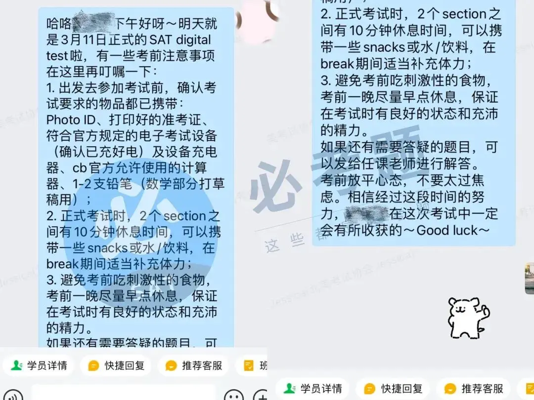因为我是第一次参加SAT考试,在考前一天,班主任老师还在群里给我发了考前注意事项,清楚地列出了考试需要携带的东西以及考前需要注意的事项,真的非常细心。带着调整好的心态和老师们的鼓励,我自信地迈进了考场,顺利完成了这次考试。