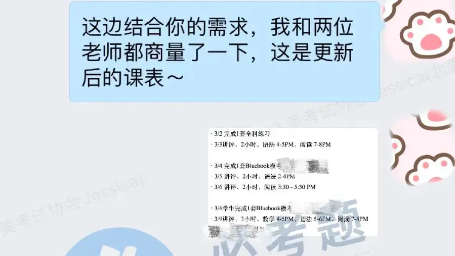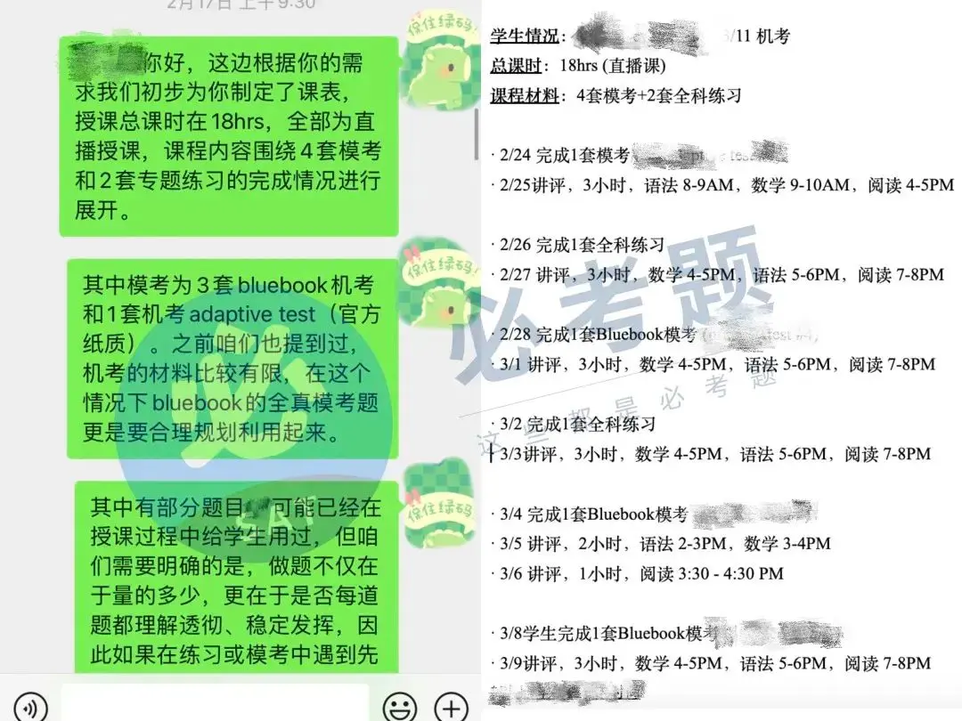 我的课程从2月24号开始,总共为期两周多,总时长18小时。在确认好课程内容和模考时间之后,清柚必考题的老师们就带着我开始正式的SAT考前冲刺了!