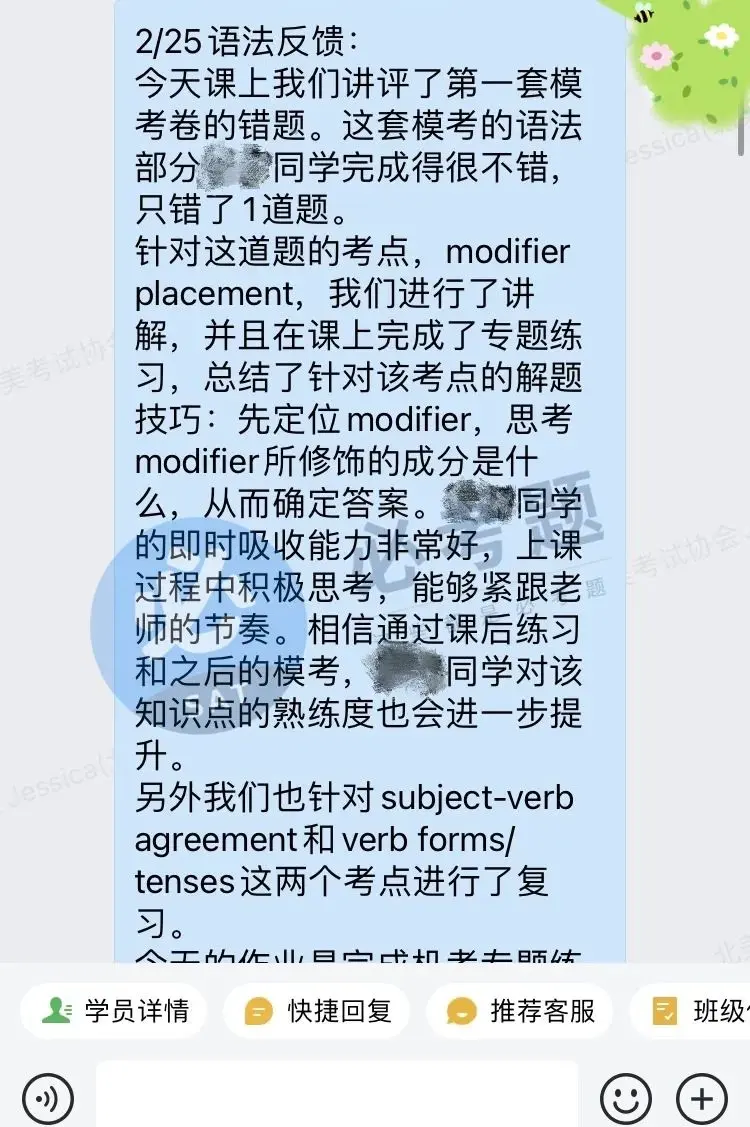 每节课后,老师们会在我的学习群内以文字的形式总结当天上课的内容,提醒我需要在课后完成哪些练习,以及下节课的计划。这样一来,我也对自己的备考规划感到更加有头绪,并且动力满满地期待下一次课上学习新的知识。